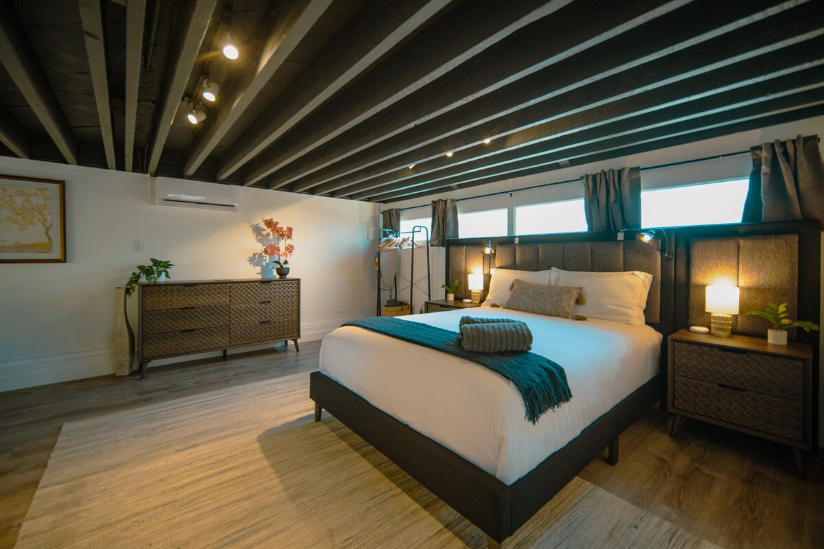 Nakamamanghang pang - industriya na loft sa gitna ng lungsod ng San Diego! Ang kamangha - manghang 3 palapag na Townhouse na ito ay mga bloke mula sa Gaslamp at nag - aalok ng magagandang itinalagang mga modernong muwebles at marangyang tuluyan. Nagtatampok ang unang palapag ng pribadong kuwarto na may kumpletong paliguan. Sa ika -2 antas ay ang pangunahing sala, na may 20 talampakang kisame na may malaking view window, kainan para sa 8, at pribadong balkonahe. Ang ika -3 antas ng eleganteng tuluyang ito ay bubukas sa isang lofted master suite na may dalawang Queen bed at full bath.
