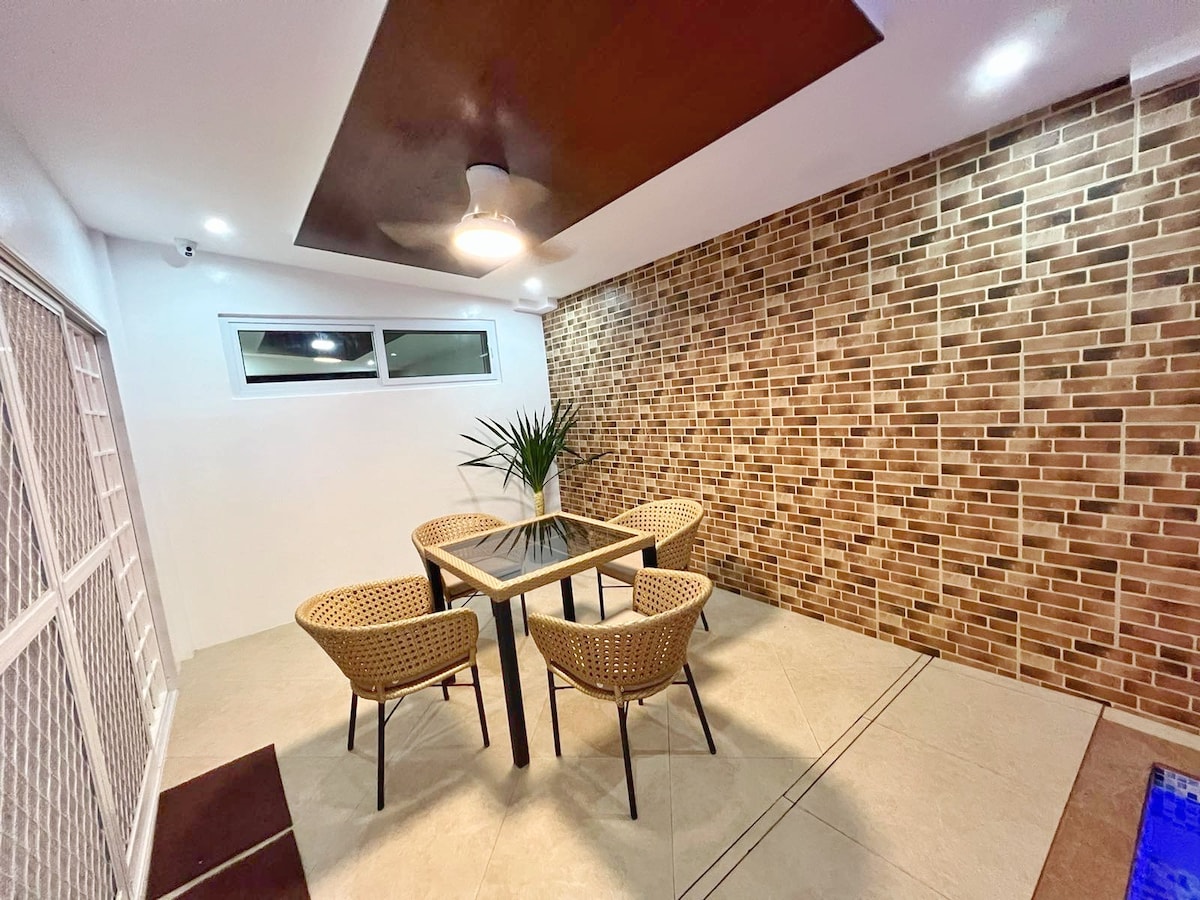 Magpahinga at magpahinga sa minimalist na 100 square meter na property na ito. Ang aming munting tuluyan ay para i - enjoy mo kasama ng mga kaibigan at pamilya. Mayroon itong plunge pool, ito ay apat at kalahating talampakan ang lalim, ang kalahati ay dalawang talampakan para lumangoy ang mga bata. Ang property ay may kusina at kainan sa labas kung saan maaari kang magrelaks at manood ng Netflix habang kumakain. May bar sa labas para ma - enjoy mo ang iyong mga inumin. Ang silid - tulugan ay may 3 queen size na kama, ganap na airconditioned. Hindi ito five - star hotel. Isa itong tuluyan.