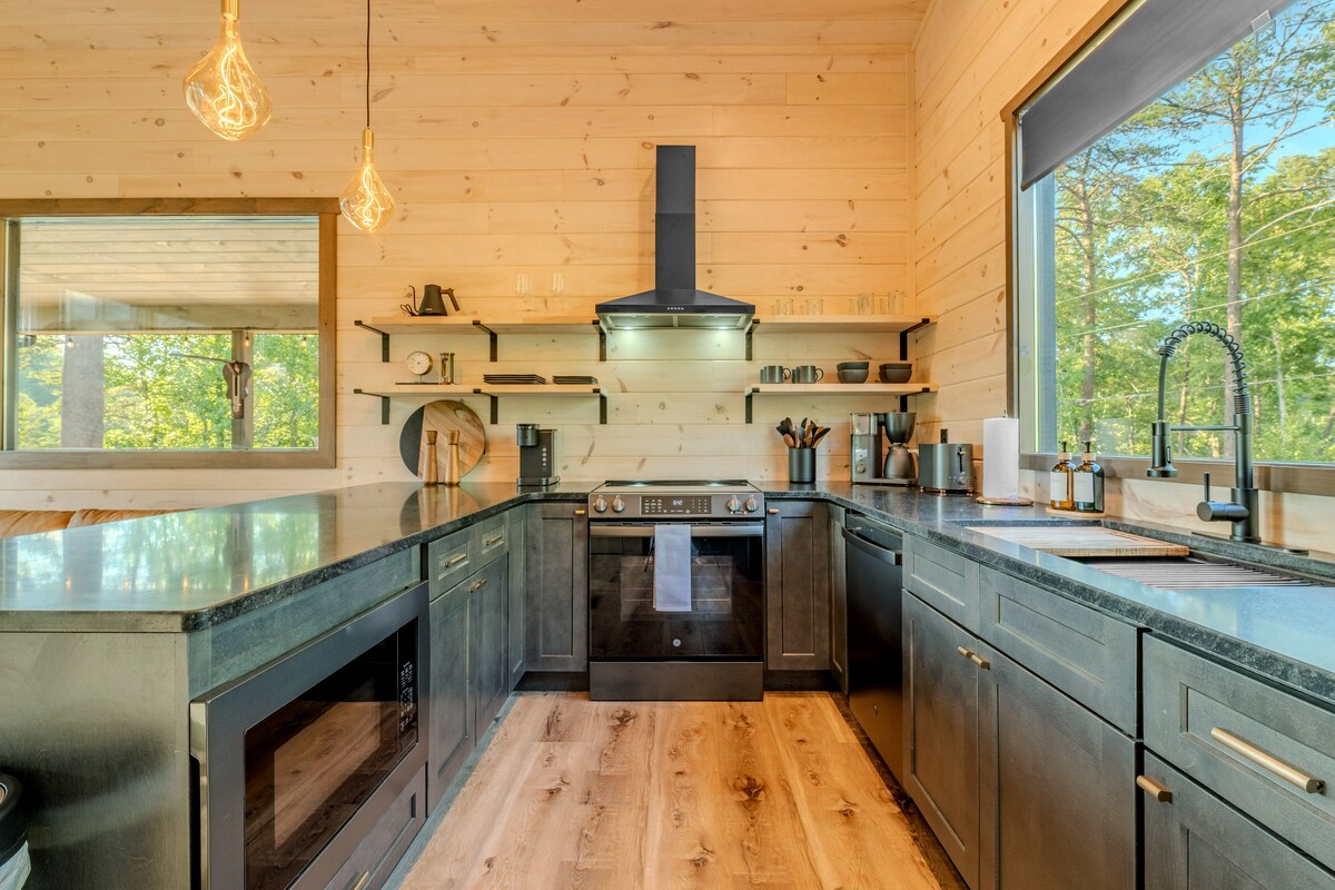 ✅Hot Tub ✅Mga tanawin ng bundok ✅Firepit (may propane) ✅Electric Fireplace ✅Basang kuwarto (malaking soaker tub at shower) ✅Blackstone Grill (ibinigay ang propane) ✅Malaking takip na beranda w/kainan sa labas ✅Brand New Modern - Compact Cabin (600 sq ft) ✅ Pribadong Gated Communityw/Security Pool ✅ ng Komunidad (pana - panahong), Tennis Courts, Pickleball Court at Playground! ✅1 Silid - tulugan (King Bed)/1 Bath w/sofa bed (queen) ✅Washer/Dryer, Dishwasher, Oven, at Refrigerator! ✅Mga vintage board game Mga ✅Cornhole Board ✅ Record Player