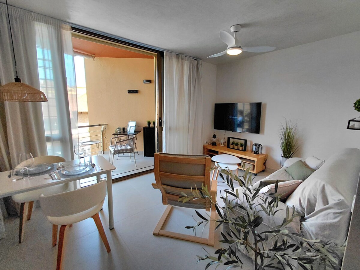 Maaliwalas na apartment, maganda, malinis at maayos. Urbanisasyon na may 2 pool at 4 na paddle court. May paradahan at WiFi. Eksaktong 1350 metro ang layo sa beach. 15 -20 minutong lakad o 3 minutong biyahe. Sa tag - init, puwede kang magparada malapit sa beach sa loob ng € 1/24 na oras. Double bed (135x190) at 2 single (90x190 at 80x180), banyo, kusina na may ceramic hob, microwave, regular at single - dose na coffee maker, washing machine, mga kagamitan sa kusina…TV Air con Mga sapin at tuwalya. Mga Mantas. Terrace