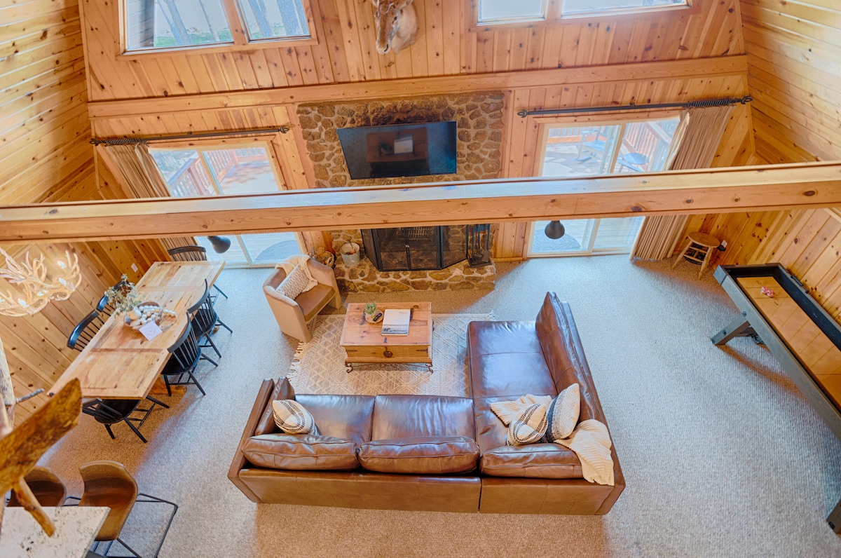 WOW... Ito ang unang pag - iisip na papasok sa iyong ulo kapag naglakad ka sa pintuan ng aming one - of - a - kind cabin. Propesyonal na idinisenyo mula sa simula, nagtatampok ang cabin na ito ng mga sumusunod: - Ang Main Cabin ay may tatlong silid - tulugan, dalawang banyo, at loft sa itaas na may anim na bunk bed na natutulog ng 12. - May arcade at game room ang hiwalay na garahe. - Sa itaas ng garahe ay isang pribadong studio na may sariling kusina, banyo, king bed, at labahan na natutulog ng dalawa (karagdagang $ 97 na singil para dito).
