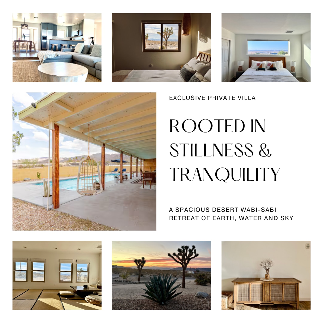 As seen in Bloomberg & TIME magazine! Welcome to The Backyard at Joshua Tree! This modern luxury home is a 3 bed, 3 bath villa featuring a brand-new pool, Pickleball court, hanging daybed, fire pit, 6-seater spa, cowboy tub, ping pong table, Bocci ball pit & Tesla charger! Enjoy dinner with a beautiful view of the Joshua Tree Sunset. This thoughtfully designed modern home is close to 29 Palms Road, only a 10-minute drive to the National Park entrance & only 3min away from main street JT!