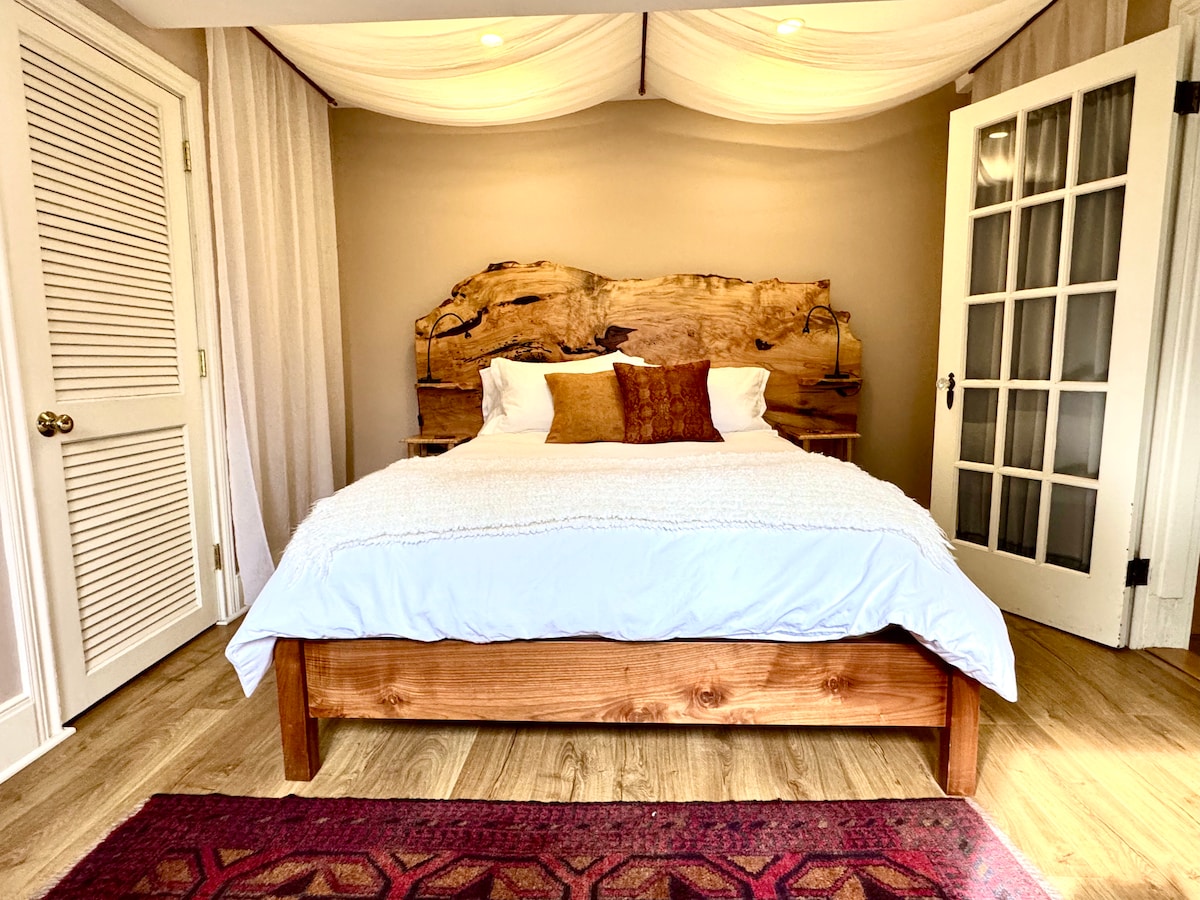 Marangyang at maaraw na suite na may pribadong paliguan, hiwalay na pasukan, Tv/sitting room, pagbabasa ng nook, desk/work area, at coffee bar. 6 na bloke papunta sa bayan, at magagandang tanawin ng Skinner Mt. Pinalamutian ng mga gawang - kamay na muwebles na gawa sa kahoy ng isa sa mga pinakakilalang gumagawa ng muwebles sa Northampton. Pribadong patyo, malaking likod - bahay na may mga pick - your - own raspberries at blueberries. Ang suite ay may pribadong parking space, at maginhawang matatagpuan malapit sa daanan ng bisikleta, at ruta 91. Magrelaks, at tuklasin ang Northampton.