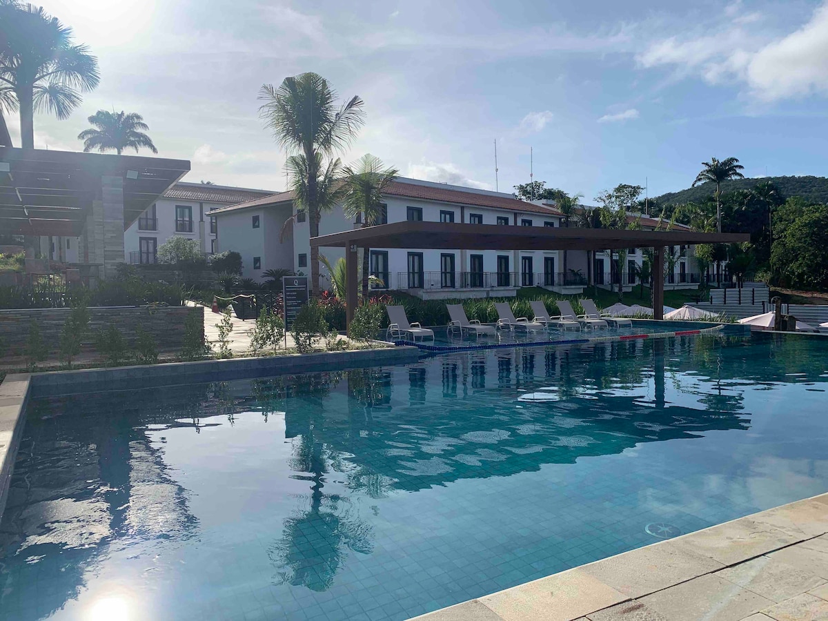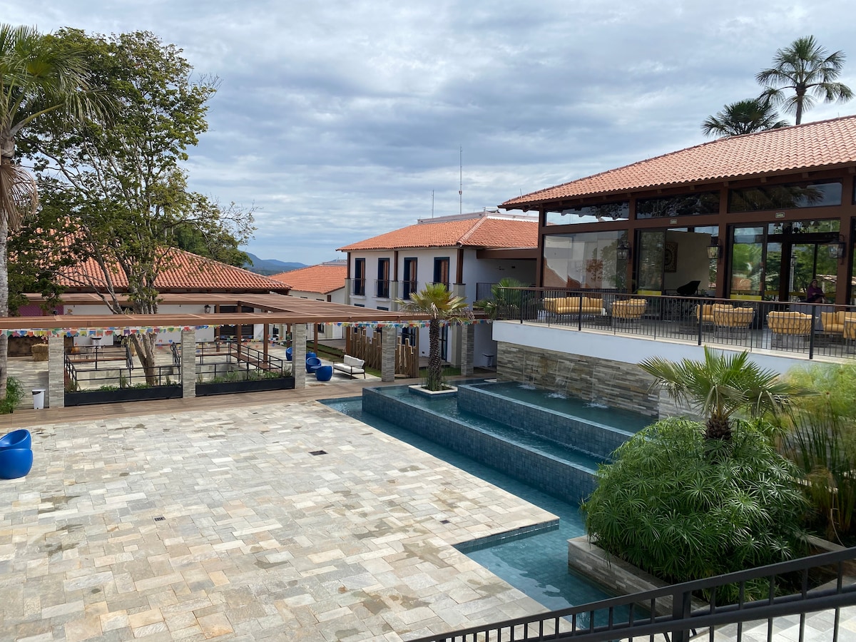 Dalhin ang buong pamilya sa magandang lugar na ito na may maraming lugar para magsaya. Apartment sa Ecoresort Quinta Santa Bárbara sa Pirenópolis, sa makasaysayang sentro ng lungsod. Madali mong mapupuntahan ang mga tindahan at restawran, puwedeng‑puwedeng iwan ang kotse mo sa libreng parking lot, at mag‑enjoy sa lungsod nang naglalakad at walang alalahanin. Masisiyahan ang mga bata sa mga libangan. May serbisyo sa hotel ang apartment para maging komportable hangga 't maaari ang iyong pamamalagi (mga linen, tuwalya, pang - araw - araw na imbakan).