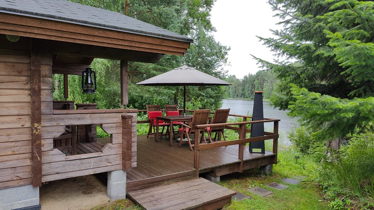 Matatagpuan ang cabin sa isang maganda at tahimik na bansa at tanawin ng lawa, kung saan maaari kang pumunta sa labas, sumakay sa bangka, lumangoy at mangisda. Ang isang mahusay na pinapanatili na driveway ay humahantong sa bakuran ng cottage. Ang cabin ay may espasyo na 24 square meters + loft + isang hiwalay na shower/toilet building na kabilang sa cabin sa tabi nito. May sauna na pinainit ng kahoy sa beach, na magagamit kung napagkasunduan nang hiwalay