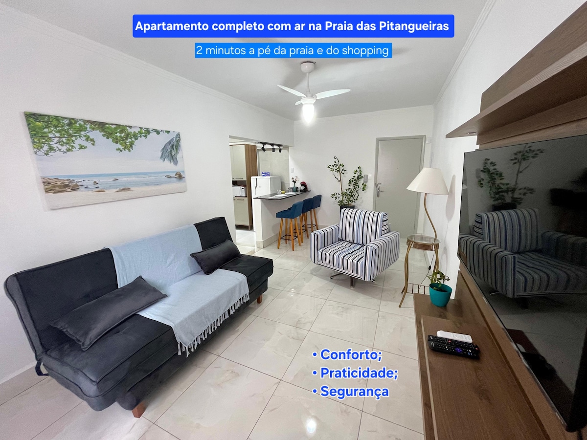 Komportableng apartment, na may mga proteksyong screen sa mga bintana, na matatagpuan 50 metro mula sa buhangin ng Pitangueiras beach, sa harap ng sikat na Avelinos bar. Napakalapit sa mga beach na Pitangueiras (50 metro), Asturias (5 minuto) at Enseada (7 minuto). Maaliwalas ang apartment, pero may magandang lokasyon, dahil malapit ito sa mga bar, restawran, tindahan, kabilang ang supermarket ng Pão de Açúcar Minuto (1 minutong lakad) at sikat na panaderya ng O Rei do Trigo (3 minutong lakad).