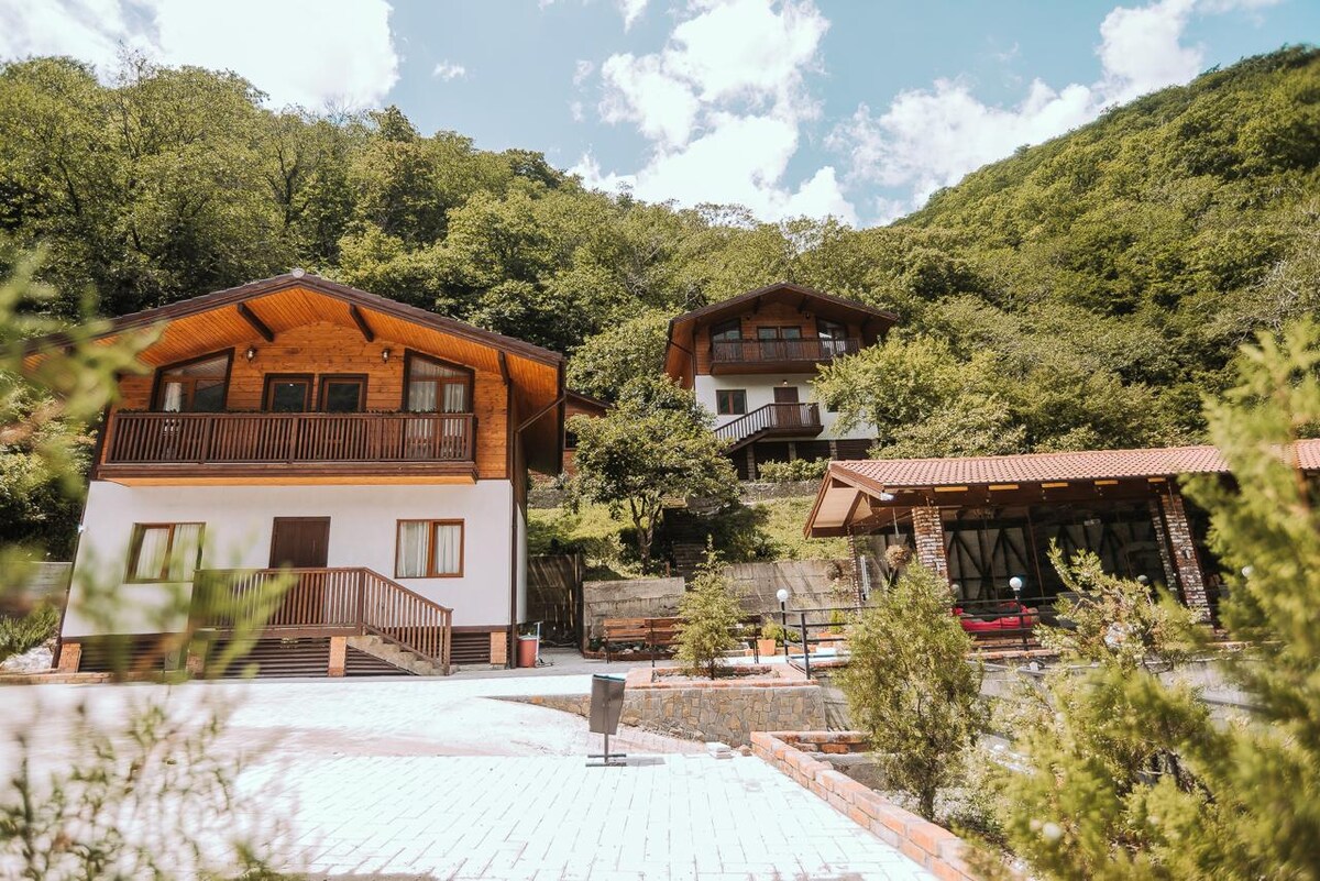 Отель расположен в Рицинском Заповеднике, возле водопада Мужские слезы, вдоль реки Бзыбь. Живописная природа, удивительной красоты ущелье, горный целебный воздух, множество озер, водопадов и других достопримечательностей, соединились в этом месте. Уютные двухэтажные коттеджи, выполнены в альпийском стиле, это придает отдыху впечатление европейского отдыха и комфорта. На территории отеля Сауна.