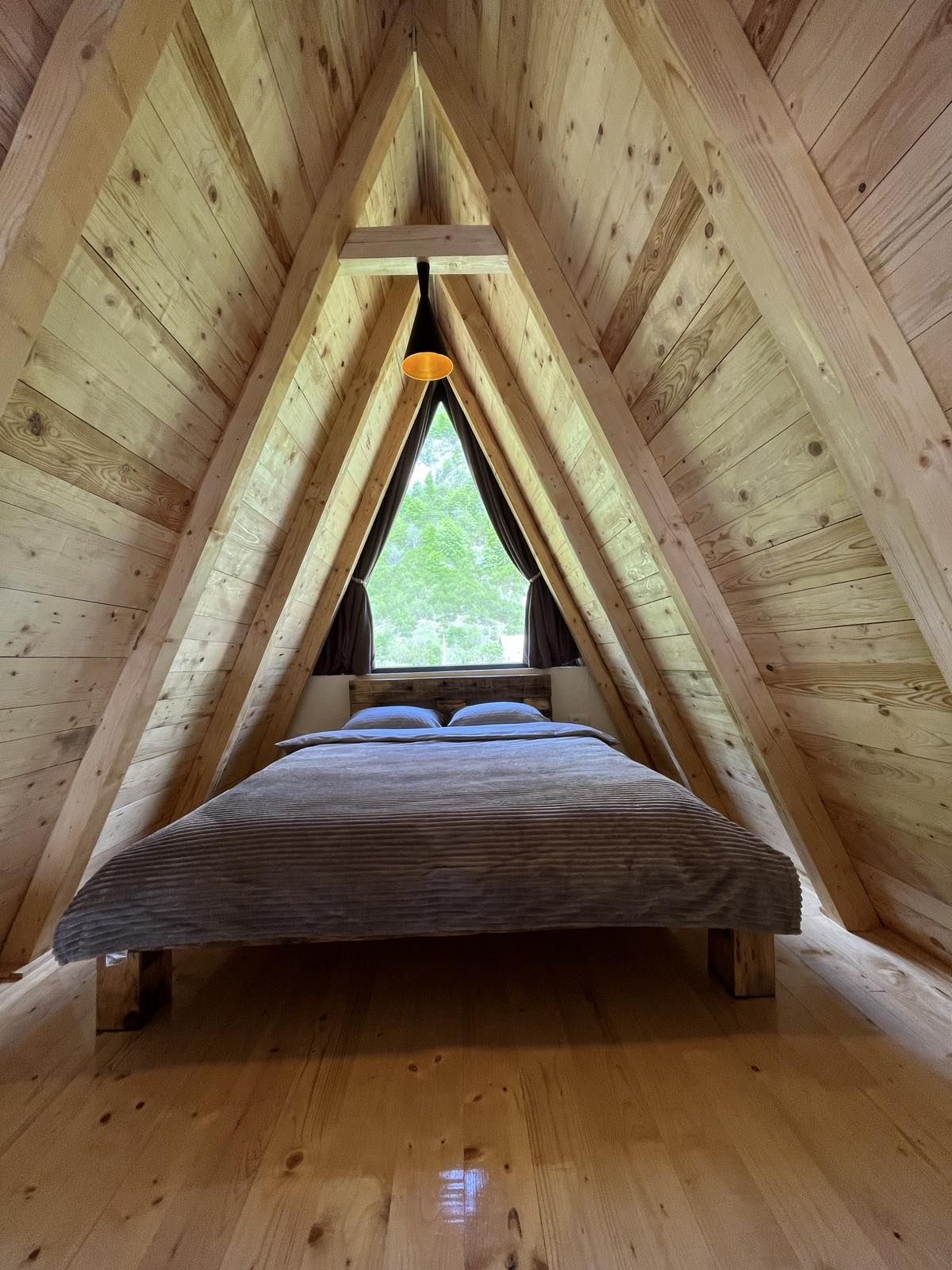 Prelijepa planinska A frame brvnara za dvoje sa terasom koja ima predivan pogled na masivnu planinu. Na 40m nalazi se planinski izvor sa veoma zdravom i kvalitetnom vodom za pice. Kreveti se mogu spojiti tako da mozete dobiti i bračni ležaj od istih. Toalet i tuš se nalazi na 35 metara od brvnare . U pitanju je poseban objekat sa toaletima sa keramičkim pločicama.