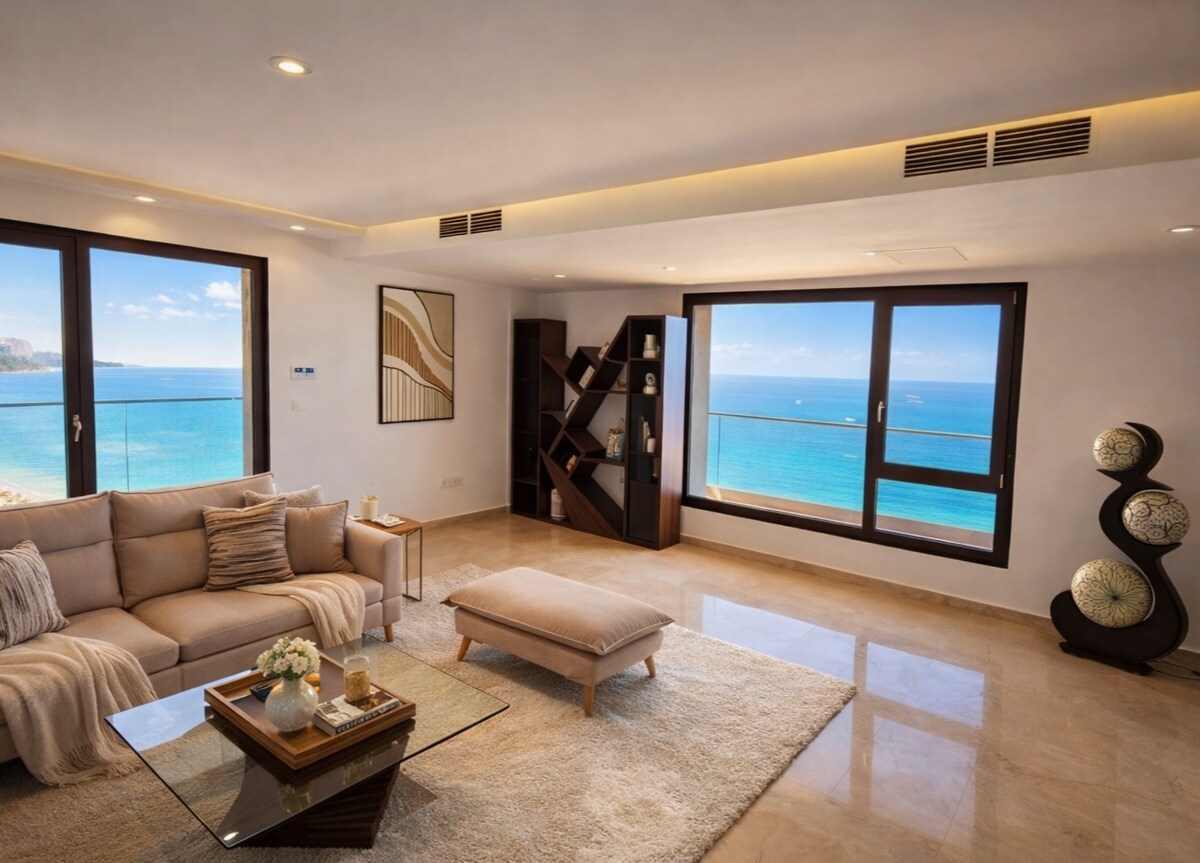 Magnifique appartement avec vue panoramique sur la mer, idéal pour un séjour relaxant entre confort et élégance. Cet appartement spacieux et lumineux se compose de : 2 grandes chambres confortables 1 lit King size 1 lit double (180 cm) Un grand salon avec vue sur mer à 180°, baigné de lumière naturelle Une cuisine américaine moderne entièrement équipée Une salle de bain avec douche à l’italienne Parking privé sécuriser en sous-sol, agent 24/7, camera de surveillance, accès contrôlé avec bip
