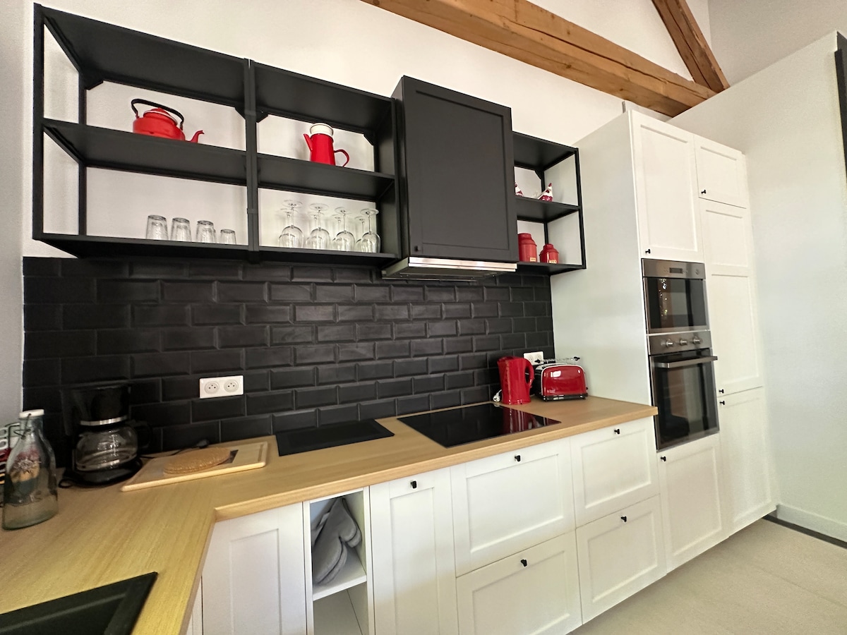 Sa gitna ng isang ligtas na ari - arian, napakahusay na bumiyahe, ang pavilion na ito na na - renovate noong 2021 at ganap na naka - air condition ay magbibigay - daan sa iyo na makapagpahinga at maging maganda ang pakiramdam. Nilagyan ang kusina ng built - in na microwave at oven, refrigerator/freezer, dishwasher, mixed coffee machine, toaster at kettle. Nag - aalok ang sala ng sofa bed at malaking smart TV na naka - mount sa pader. Panlabas na mesa at upuan I
