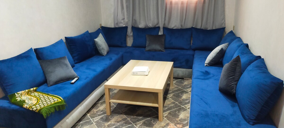 Maganda ang pagkakatayo nito at dinisenyo ang flat na 2 silid - tulugan sa ika -1 palapag. Maluwag ito, maayos na inayos at pinalamutian. 1 kuwartong may double bed, 1 kuwartong may twin bed, malaking sitting room, Moroccan style, settees kung saan maaaring matulog ang isa pang 3 bisita., ang kusina ay maluwag na nilagyan ng bukas na plano. 2(shower, lavatory at toilet). Libreng WI FI sa bahay. libreng access sa terrace sa itaas na palapag, may mga tanawin ng karagatan at ang kabuuan ng Imsouane, isang magandang lugar para tangkilikin ang kape sa umaga.