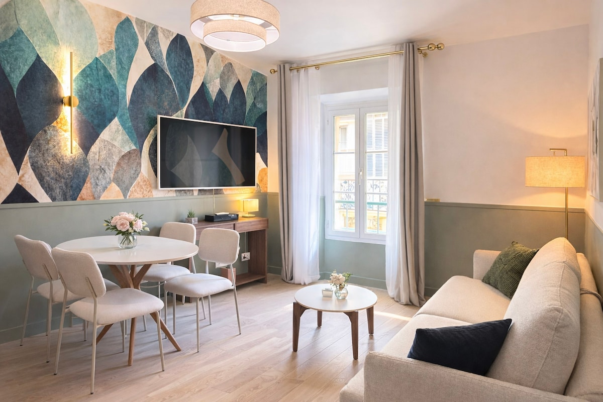 Ang maliwanag, naka - air condition, na cross - room na ito ay bubukas sa isang pribadong balkonahe kung saan matatanaw ang isang mapayapang hardin. Pinong dekorasyon, pambihirang queen size bedding, kusina na may kumpletong kagamitan at napakabilis na hibla para sa ganap na kaginhawaan. Malapit sa Palais des Festivals, mga beach at merkado ng Forville, madaling mapupuntahan ang lahat. Mainam para sa pamamalagi sa negosyo o bakasyon ng matagumpay na mag - asawa. Balkonahe kung saan matatanaw ang isang pribadong hardin. Tahimik at residensyal ang kapitbahayan.