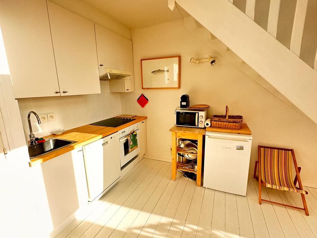 Nakakabighaning studio na kumpleto sa kagamitan at 100 metro ang layo sa beach at mga tindahan. Napakaluwag, madaling tumanggap ang apartment ng 4 na tao salamat sa 140 na natutulog sa mezzanine at komportableng convertible nito. Kusina na may malaking countertop, refrigerator/freezer, 4-burner ceramic hob, rotating heat oven, microwave, dishwasher, Nespresso coffee maker, at kettle. Kasama ang linen para sa paglilinis, higaan, at paliguan.