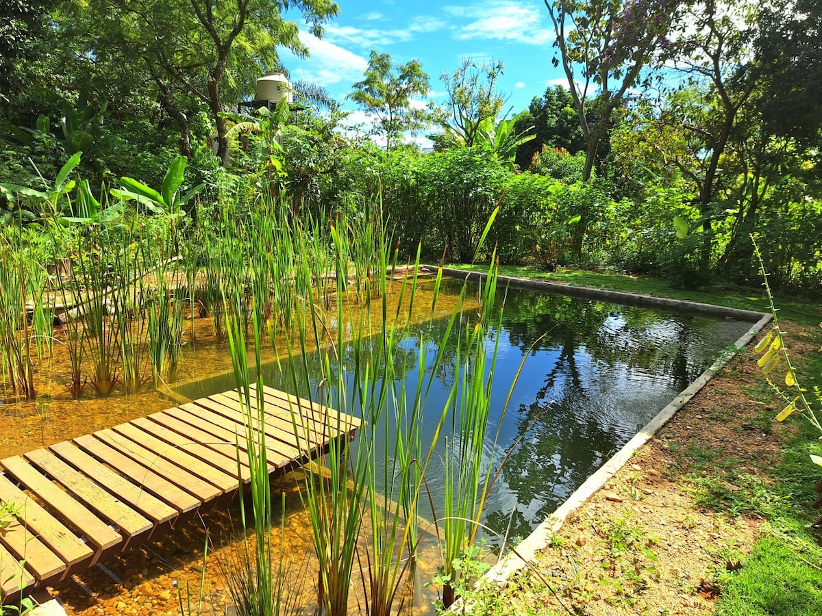 Loft com piscina viva, banheira e fogão a lenha