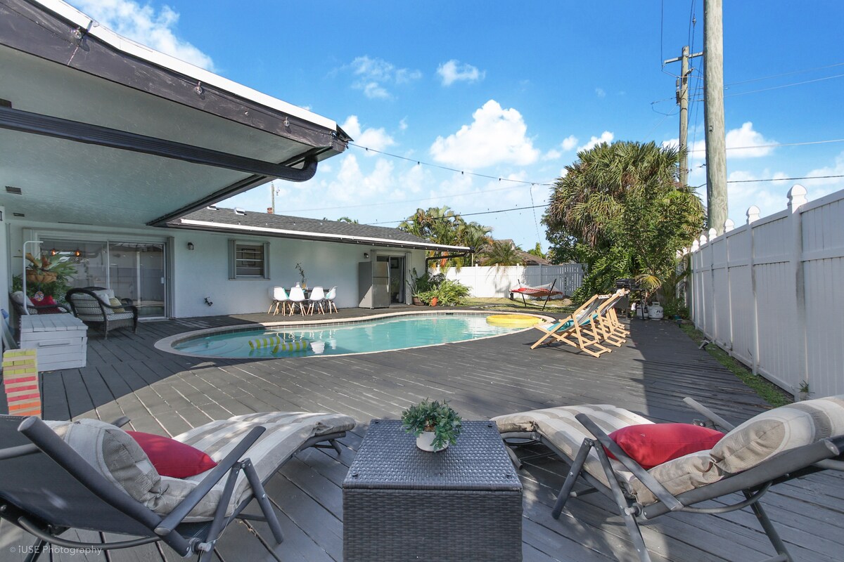 Magrelaks kasama ang buong pamilya sa 🌴 Tropical Staycation! Matatagpuan ang napakalaking 5 silid - tulugan / 4 na paliguan na ito sa isa sa pinakamagagandang at pinakaligtas na kapitbahayan sa South Florida. Kumpleto ang kagamitan ng property para sa lahat! Ang Tropical Oasis na ito ay nasa gitna ng mga shopping center at restawran, ang ✈️ FLL Airport at 🚢 Port Everglades ay 15 minuto ang layo, at kahit na ang karamihan ng Miami ay 25 minuto lang ang layo. Puwedeng tumanggap ang property ng maraming gamit at pamilya dahil sa malawak na layout at mga opsyon sa pagtulog nito.