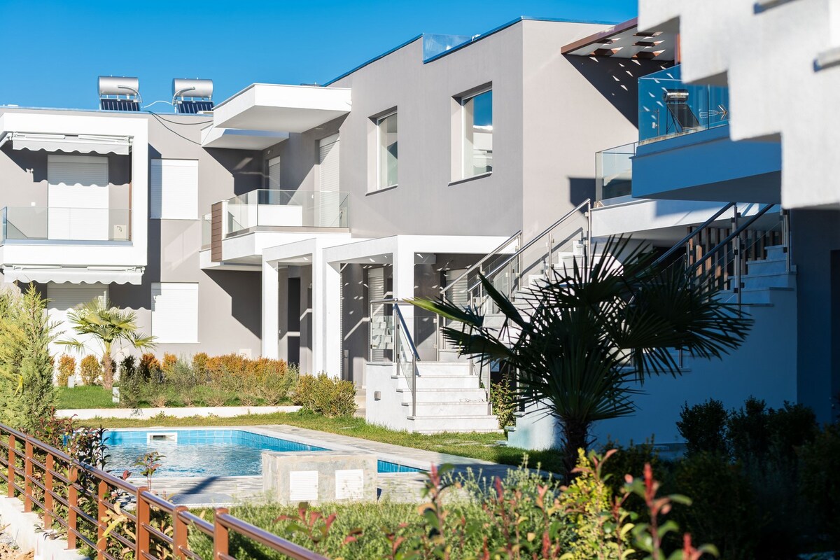 Magandang apartment na 47 sqm., 2 kuwarto sa isang magiliw na kapitbahayan na may komportableng balkonahe at mga outdoor furniture para sa pagpapahinga! Ang apartment ay 5 minutong biyahe mula sa sentro ng lungsod at 1km ang layo mula sa pinakamalapit na beach na may beach restaurant at cafe bar. Ang modernong disenyo at ang kalinisan ng mga lugar sa isang tahimik at payapang kapitbahayan ang magbibigay sa iyong karanasan ng pananatili na kakaiba at hindi malilimutan.