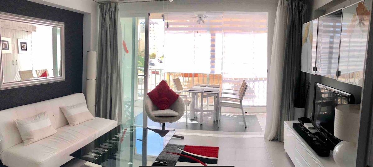 Isama ang iyong pamilya para makapagpahinga at magsaya nang magkasama. Binubuo ang apartment ng kuwartong may malaking double bed na may posibilidad na mag - set up ng hanggang dalawang single bed, sala na nilagyan ng sofa bed, kung saan komportableng natutulog ang dalawang tao, isang travel crib, 2 min papunta sa beach at promenade sa harap ng beach, kung saan may mga restawran at boutique. 5min papunta sa mga tindahan, sarado ang mga parmasya, na ginagawang ligtas para sa mga bata, may tatlong pool.