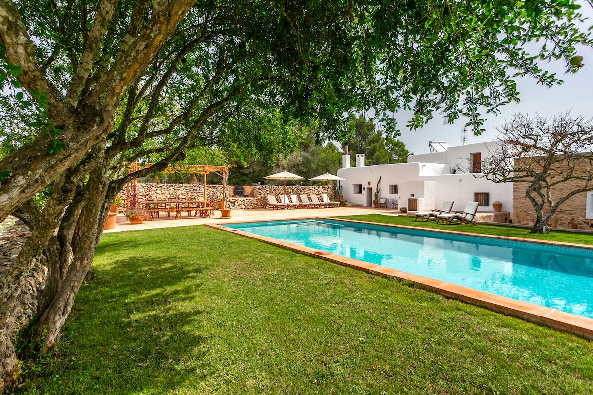 Kaakit - akit, boutique - style na villa na matatagpuan sa isang romantikong berdeng hardin na may mga lumang puno at bulaklak. Sa pamamagitan ng mga terrace, chillout area, at magandang maliit na pribadong pool, nag - aalok ang property ng magandang tuluyan at privacy para sa 8 hanggang 9 na bisita. Lahat ng 4 na silid - tulugan na may AC. Internet: high - speed fiber - optic! Sa loob ng 6 na minutong lakad, makakarating ka sa magandang sandy beach ng Cala Llonga. 4 na minutong lakad lang ang layo ng mga restawran, supermarket, tindahan, at taxi stand. 5 minutong biyahe ang layo ng Ibiza golf o Santa Eularia. Aabutin nang 12 minuto ang biyahe papunta sa Ibiza Town.