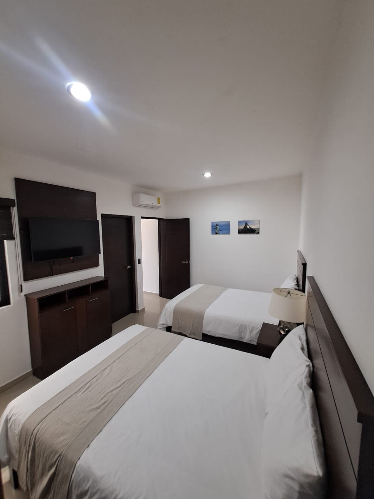 Habitacion para 4 personas con alberca consta de dos camas matrimoniales, contamos con alberca y pantalla gigante en Area de alberca, a dos calles de playa y 7 minutos de del malecón, son varios colores por eso se adjuntan diferentes imágenes