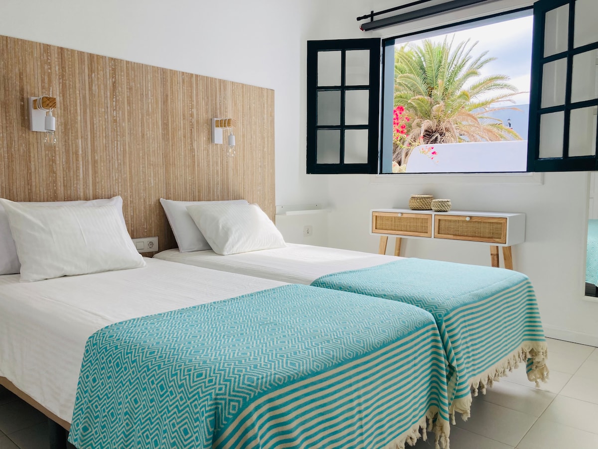 Maginhawang apartment kung saan matatanaw ang pool mula sa master bedroom at sala, maaliwalas at maliwanag sa bawat kuwarto, kung saan makakatakas ka at makakapag - enjoy sa tahimik na bakasyon. Matatagpuan ito sa isang tahimik na complex ng 16 na apartment ng tipikal na konstruksyon ng Lanzarote, na may swimming pool , solarium at mga common area na may mga duyan, at may mga kalapit na paradahan at 10 minutong lakad lang mula sa mga ginintuang sand beach at coves ng kristal na tubig.