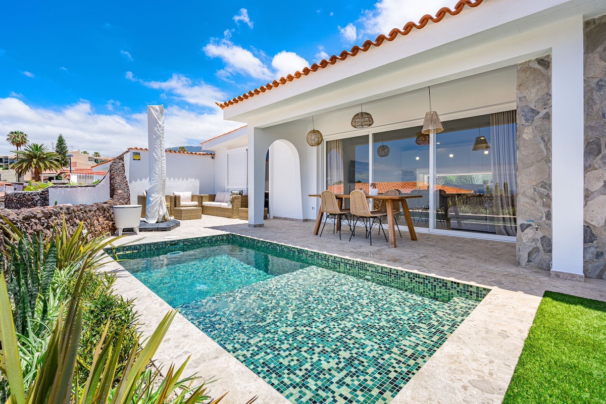 Nueva vIlla recién reformada con piscina privada climatizada y gran jardín de 300 metros cuadrados ubicada en primera línea del mar, en un entorno de hoteles de lujo como Sheraton La Caleta, Riu Palace, Coral Suites, H10 costa Adeje. Además forma parte del Residencial Adeje Park donde hay 3 piscinas, una de ellas climatizada y parque infantil. La famosa playa del Duque está a 800 metros a pie. También está muy cerca de la caleta de Adeje, un pueblo marinero famoso por sus numerosos restaurantes