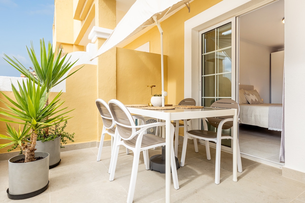 Maligayang pagdating sa aming ganap na inayos na studio na may kahanga - hangang tanawin ng karagatan, malapit sa magagandang beach at mga surf spot. Nilagyan ng mabilis na Wifi, smart TV, kumpletong kusina, kahanga - hangang shower, washing machine at lahat ng kaginhawaan. Libre ang access ng mga bisita sa swimming pool. Nasa harap mismo ng studio ang istasyon ng bus at taxi. May mga supermarket at tindahan sa harap ng studio. 5 minutong lakad lang mula sa Playa de las Américas, 8 mula sa Playa de Troya. 15 km mula sa airport.