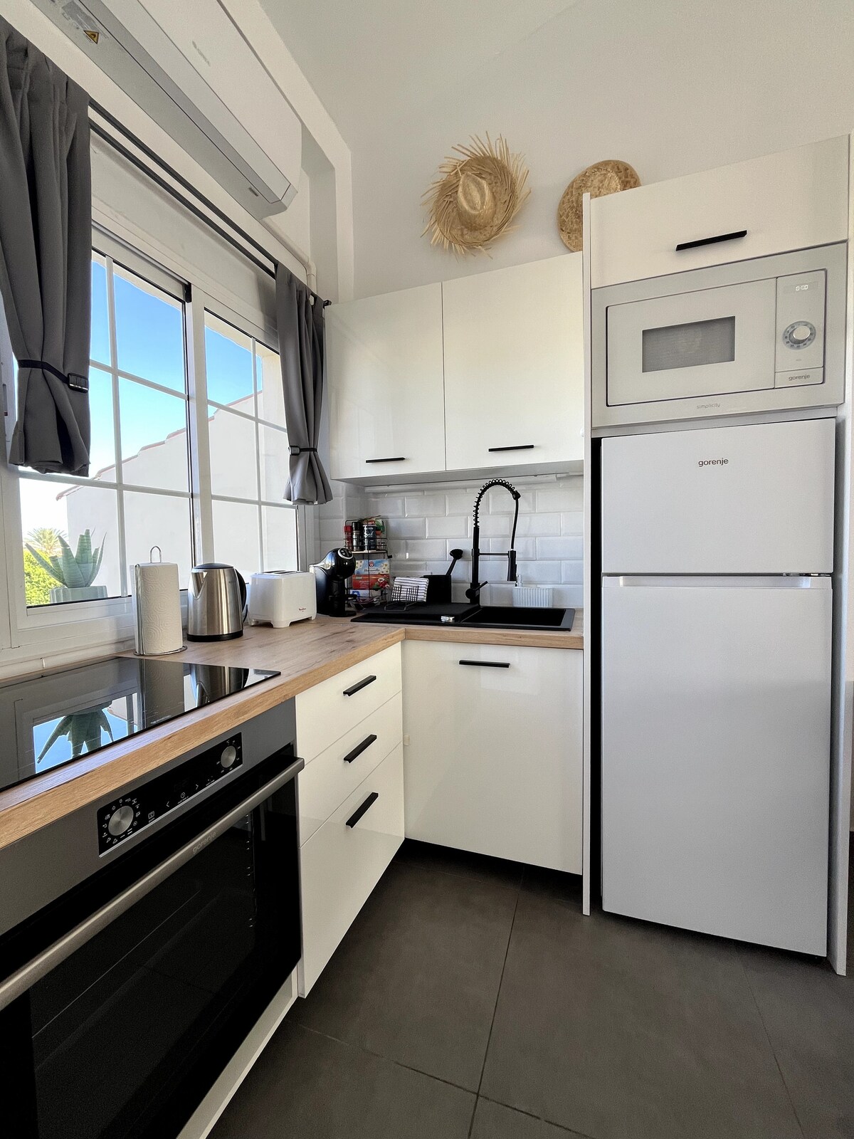 ANG APARTMENT: Dalawang silid - tulugan na may dalawang sukat na higaan ang bawat isa, na may kasamang mga aparador, sentral na sala na may dalawang 1.80 m na sukat na sofa - sahig. May takip na terrace na may mesa at apat na upuan. Buong banyo na may shower at hairdryer. Libreng WiFi. Smart - TV, kusina na may hob, dishwasher, microwave, washing machine, refrigerator na may independiyenteng freezer at maliliit na kasangkapan. MGA LIMITASYON: Ikalawang palapag na walang elevator. Hindi naka - enable ang wheelchair. Hindi puwedeng manigarilyo sa loob ng apartment