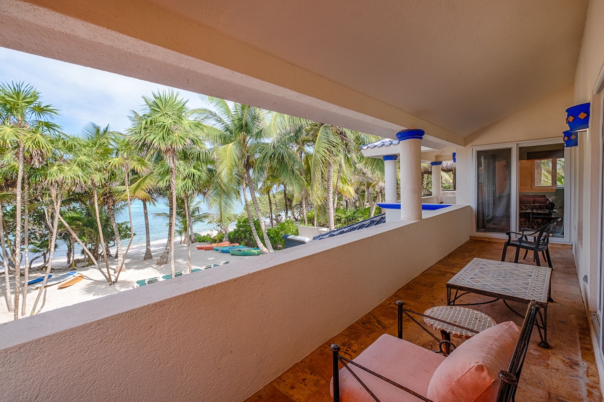 Itinatag ang bakasyunan! Casa Cielo mula sa Akumal Direct Reservations! Elegante at eclectic na marangyang villa sa tabing‑dagat na nasa South Akumal beach, isang tirahan at gated na komunidad. Matatagpuan ito ilang minuto lang sa timog ng Akumal proper at nasa isa sa pinakamagagandang beach sa lugar. Nag-aalok ang Casa Cielo ng parehong kaginhawa at kagandahan! Tangkilikin ang kamangha - manghang villa na ito na may pribadong pool, mga kayak, at paddleboard! May kape, prutas, at mga inihurnong pagkain para makapaghanda kayo ng continental breakfast.