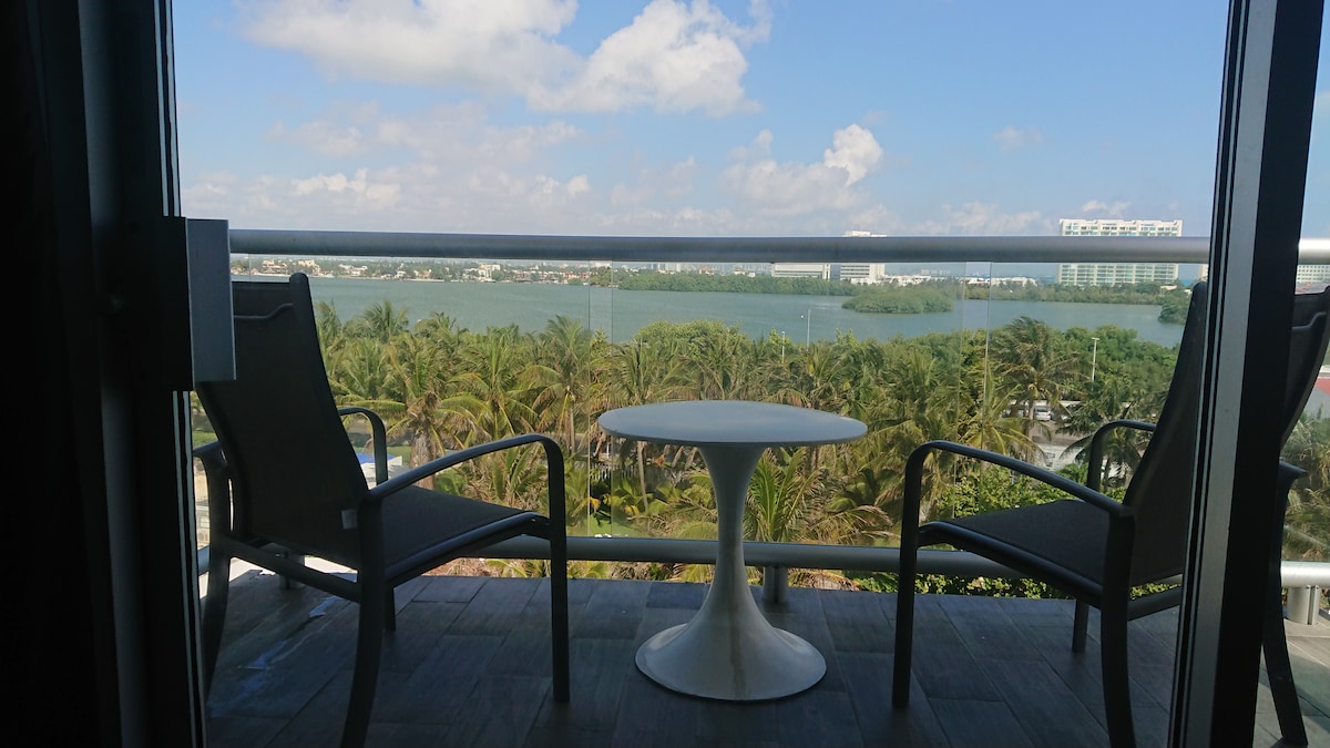 Studio apartment, na matatagpuan sa kilometro 9.5 ng Cancun 's Hotel Zone, sa tabi ng hard rock cafe, 24/7 na mga convenience store na malapit sa, 24/7 na mga serbisyo ng bus sa harap mismo, maigsing distansya mula sa party zone, at ang kamangha - manghang beach bilang patyo na mayroon kang direktang access. Direktang may tanawin ng balkonahe ang Nichupte Lagoon at makikita mo rin ang bahagi ng beach mula rito. ito ay isang Condominium, ang apartment ay hindi kasama ang pang - araw - araw na paglilinis.