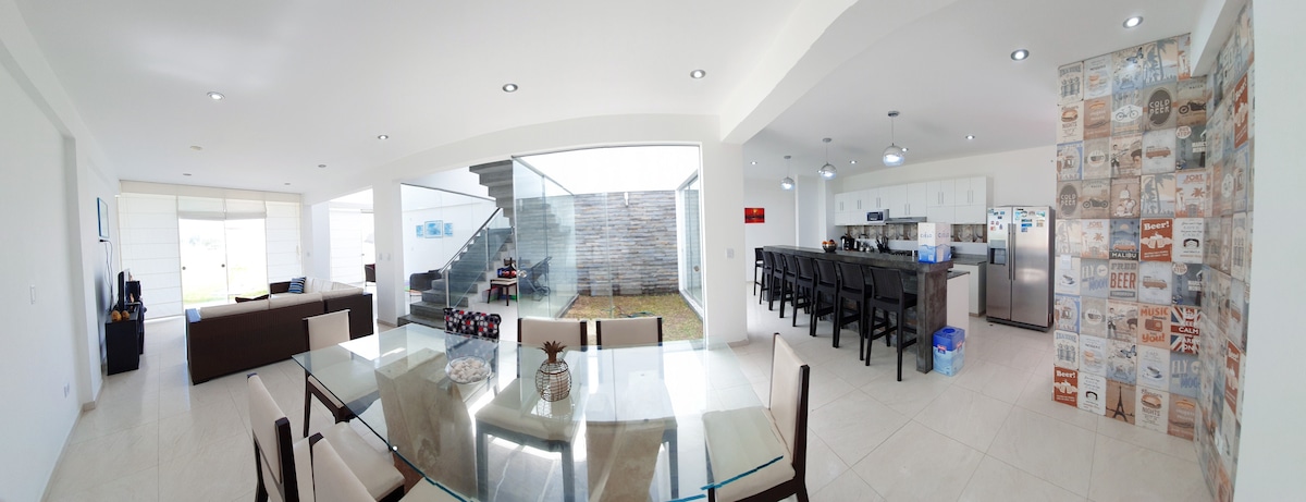 Oceanfront cottage (km 84.4 Panamericana Sur). 1000m² ng mga berdeng lugar, heated pool at grill. 6 na silid - tulugan (3 en suite): 5 na may 2 double bed, 1 na may double bed at kuna; hanggang 20 tao. Tennis table, foosball, internet at TV. Condominium na may natural na lagoon, perpekto para sa birdwatching, mga laro, merkado, 24/7 na seguridad (summer restaurant). Delivery Wong/Vivanda. Direktang access sa beach (malakas na alon). 5 minuto mula sa Totoritas at La Ensenada, 10 minuto mula sa Boulevard de Asia at 30 minuto mula sa Calango at Azpitia.