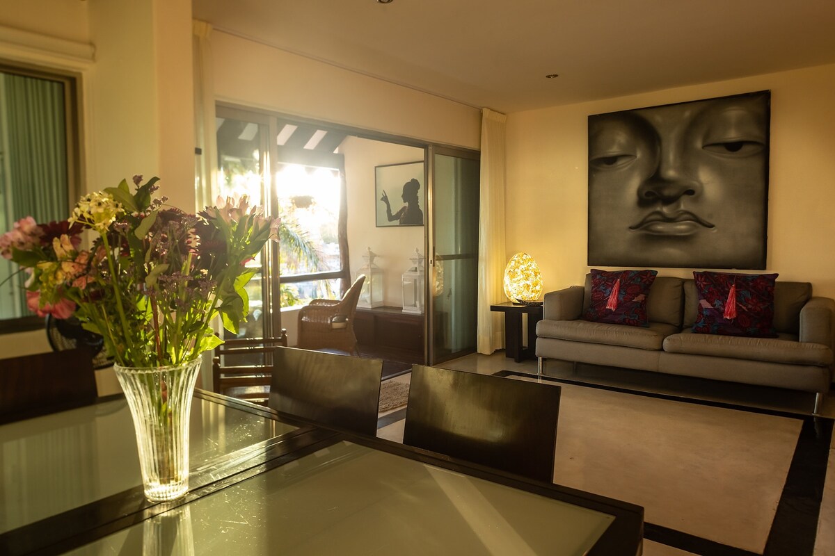 Matatagpuan sa gitna ng apartment na may malaking hardin 3 bloke lang mula sa dagat at shopping mall Libreng pribadong paradahan Tahimik at ligtas na lugar High Speed WiFi at 32'smart TV Mainit na tubig, AC at kumpletong gamit sa kusina 1 higaan Mag - enjoy sa labas sa pagbabasa ng libro o pag - enjoy sa pag - inom 2 sun bed sa hardin SKY tour, snorkeling, mga nagsisimula sa diving at bihasang Rekomendasyon ng mga restawran, lugar na bibisitahin, upa ng kotse at motorsiklo Perpektong lugar para sa iyong mga araw sa Cozumel
