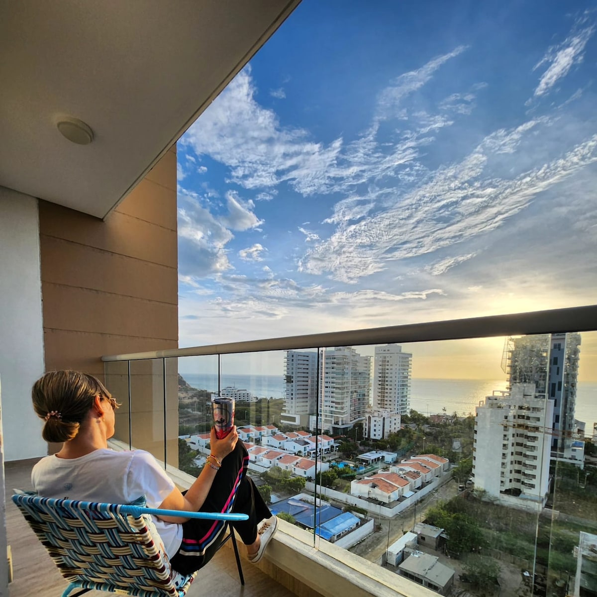 Ipinapangako namin na ang tanawin mula sa aming balkonahe ay humanga sa iyo, lalo na ang mga sunset!!! Magrerelaks ka sa modernong Apartment sa isa sa mga pinakamagagandang Beach Club ng Santa Marta! Maganda ang dekorasyon ng apartment, Wifi, at kusinang kumpleto ang kagamitan. Sa gusali, makakahanap ka ng mga swimming pool, hot tub, bar, restaurant, pribadong access sa beach at marami pang iba. Ang mga tent sa beach ay pag - aari ng beach club at walang bayad. Napakatahimik at hindi masikip ang beach (kumpara sa Rodadero :P)