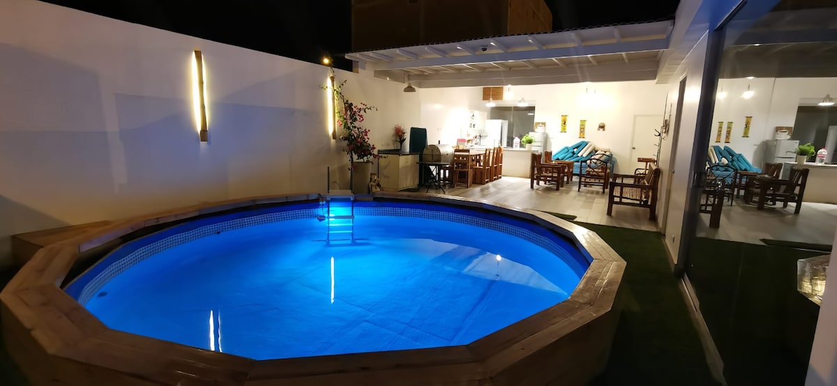 Napakalawak na bahay at malaking nakabalangkas na pool, ang pool ay may lapad na 5.50 metro at may lalim na 1.40 metro, Ang bahay ay may 4 na silid - tulugan, 2 banyo, kumpletong kusina. sala , silid - kainan, terrace at grill area, Ipinagbabawal ang mga party, Dapat ipadala ang listahan ng bisita 4 na oras bago mag - check in Lugar para iparada ang 2 sasakyan