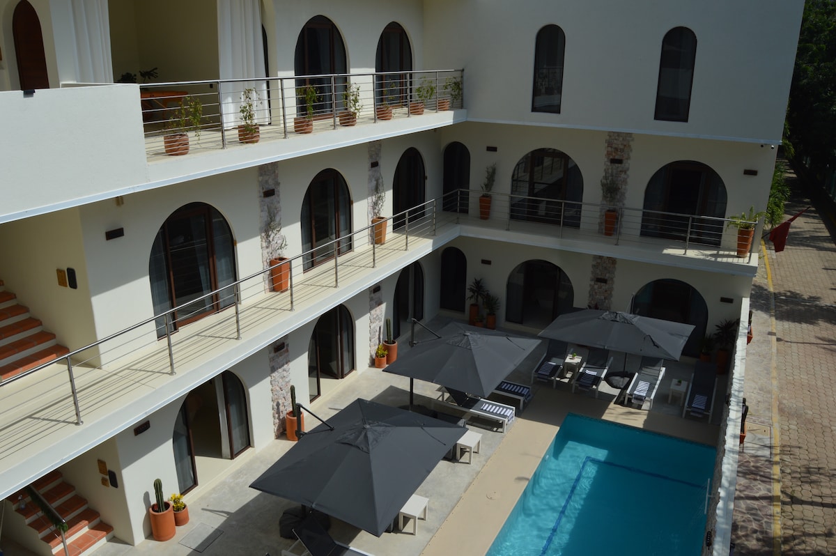 “Puwede kang mag - check out anumang oras na gusto mo pero hindi ka aalis” Isa kaming pamilyang Mexican na nagmamahal sa Zipolite; nasa unang yugto kami ng magandang proyekto na may sigasig at pagmamahal na ibinabahagi namin sa iyo. 7 minutong lakad lang ang layo mo papunta sa unang access sa beach at 10 minuto mula sa cobblestone na pangunahing kalye. Magugustuhan mo ang isang mahiwaga at natatanging lugar.