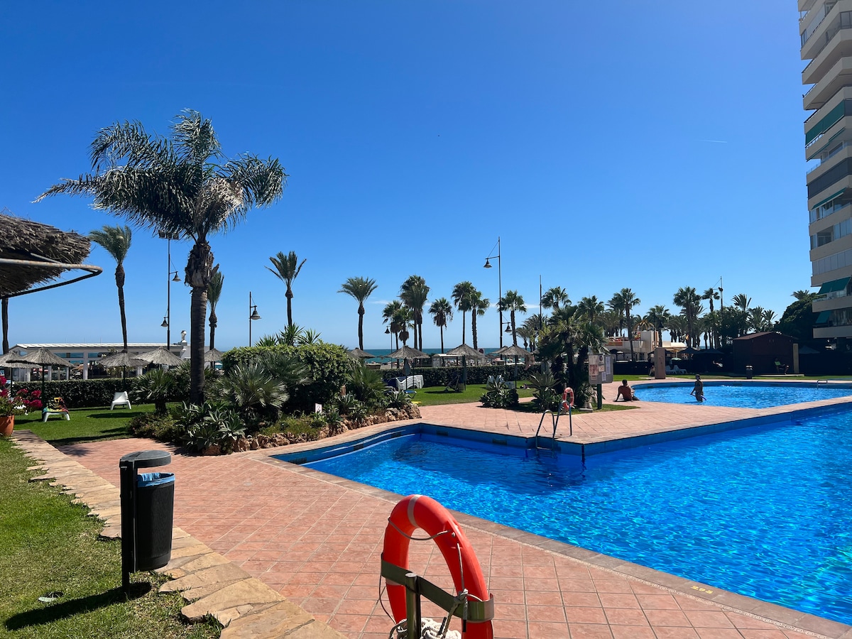 MALAGA BEACH!! Triple AAA Location. Full ocean view! Luxurious, spacious Studio Apt with separate, fully fitted kitchen and bathroom.Terrace with breathtaking views over Mediterranean Sea, Malaga and Sierra Nevada. Bajondillo-Torremolinos..20 min. to Malaga Centre by metro. Parking, Tennis Court, Large Swimming Pool, with restaurant and bar, Lifeguard, 24/7 Reception/Fiberglass-high speed internet, Comfortable Bed and modernly furnished. Elevator access to the Beach. Beautiful mature garden.