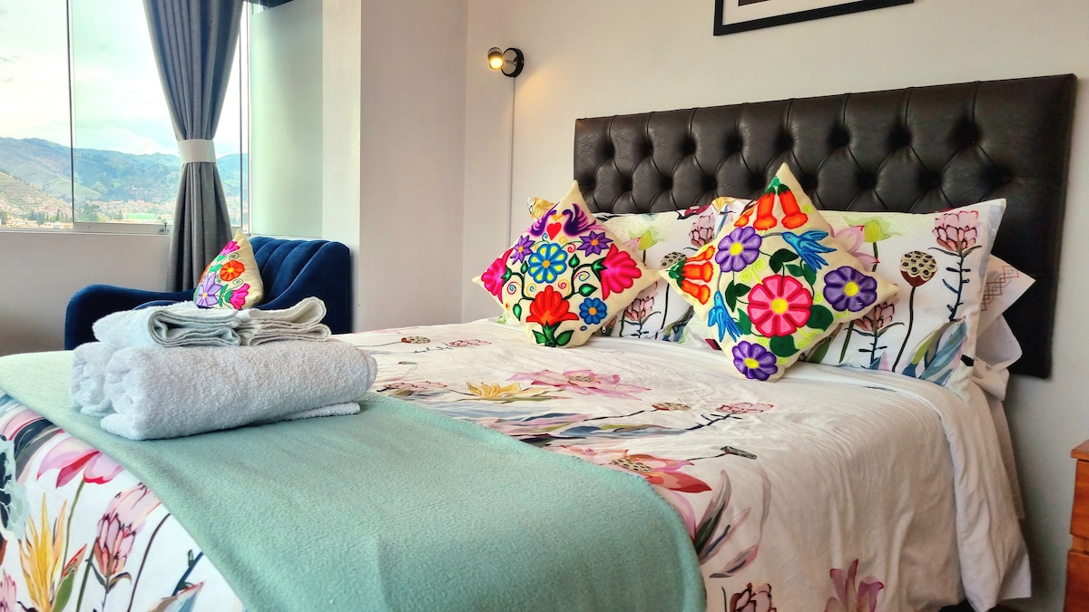 Lahat ng hinahanap mo para sa di‑malilimutang biyahe mo sa Cusco 💜 Pribadong studio, queen bed, mainit na tubig, kusina, wifi, smart TV na may espresso machine at magandang tanawin ng Cusco na may mga blackout curtain, maganda para sa pagpapahinga na may access sa terrace. Matatagpuan 4 na minuto mula sa pangunahing plaza at 1 minuto mula sa maliit na plaza ng San Blas, madaling ma-access ang mga tindahan, restawran, arkeolohikal na lugar. Matatagpuan sa ikalimang palapag nang walang elevator para sa mga mahilig sa adventure at gustong magkaroon ng di-malilimutang karanasan.