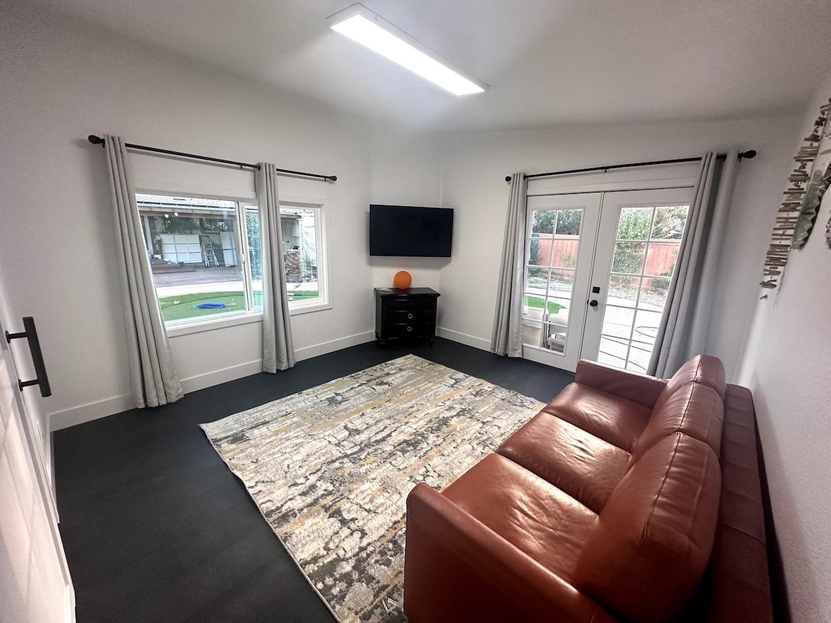 Welcome to your perfect getaway! This stylish and cozy 1-bedroom guest house offers a spacious, open floor plan designed for ultimate comfort and relaxation. Ideal for solo travelers, couples, or small groups, the space is thoughtfully designed with modern furniture, neutral tones, and recessed lighting, creating a warm and inviting atmosphere. The guest house features a queen-sized bed in the sleeping area, with a queen-size sleeper sofa in the living room to accommodate extra guests.