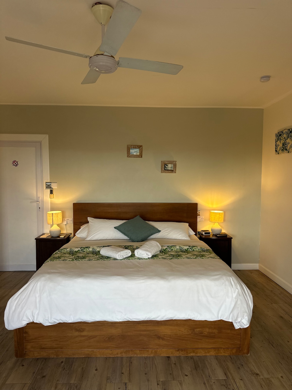 Relax in our comfortable King room with king-sized orthopedic mattresses and private bathroom with walk-in shower. 25 sq. meters rooms include free wifi, flat screen tv, air-conditioning, ceiling fan, wardrobe, safe deposit box, desk, in-room tea & coffee,also flat screen tv with international channel, private bathroom and bathroom amenities. Maximum occupancy two adults (Double)