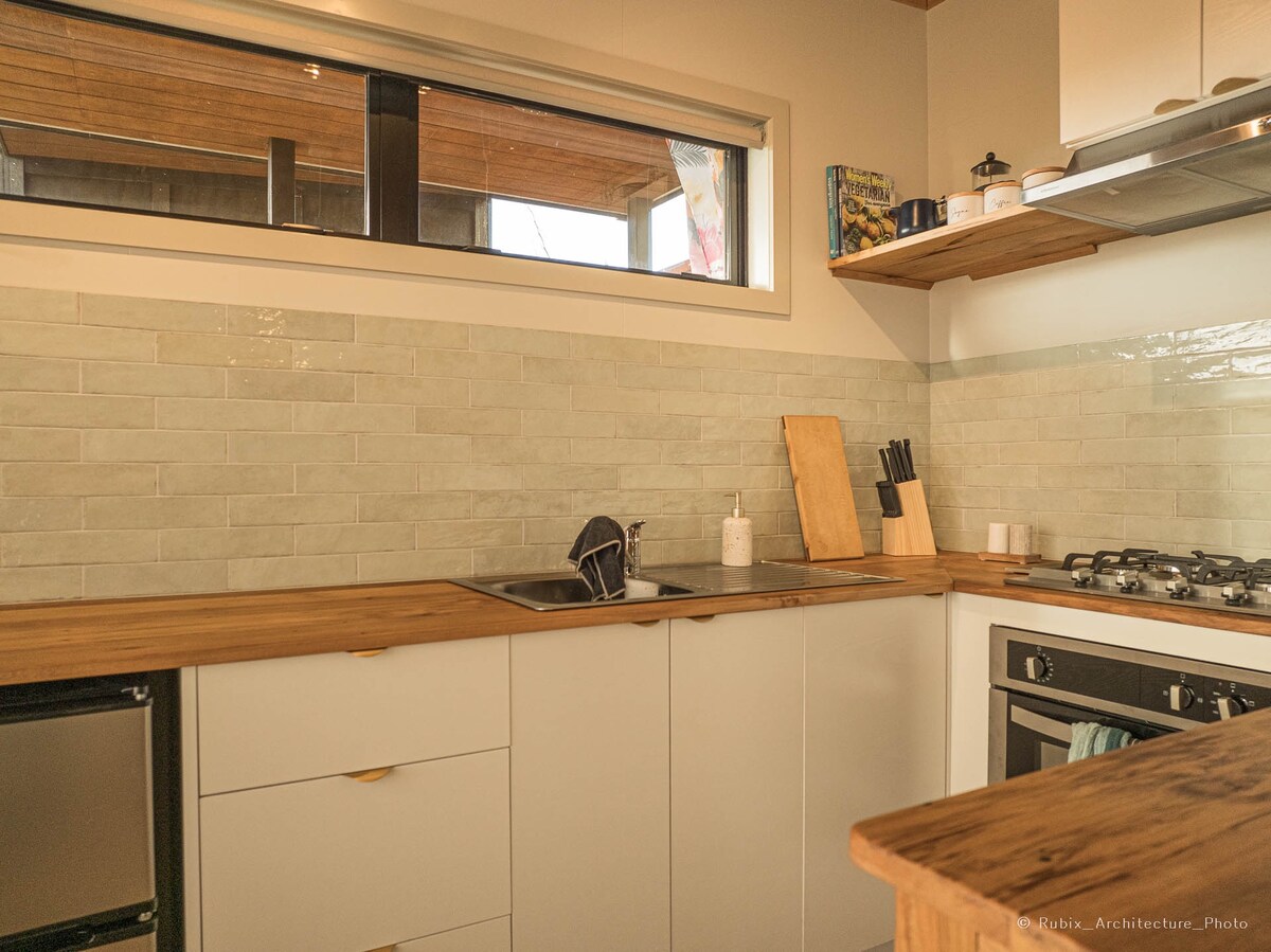 Langhapin ang sariwang hangin ng bansa sa kontemporaryong bakasyunan sa arkitektura na ito. Sa labas, nagtatampok ang tuluyan ng masinop na pang - industriyang aesthetic at pribadong outdoor bath, habang ang loob ay may boutique design style, neutral greys, at wood accent. Matatagpuan ang country stay sa isang tipikal na kalsada ng bansa sa New Zealand. Napapaligiran ng mga dairy farm at kend} na mga orchard ng prutas, maaaring makita ng mga bisita ang mga magsasaka tungkol sa kanilang pang - araw - araw na trabaho. Huwag mag - atubiling mag - wave out sa kanila kung magmaneho sila sa kanilang mga traktora.
