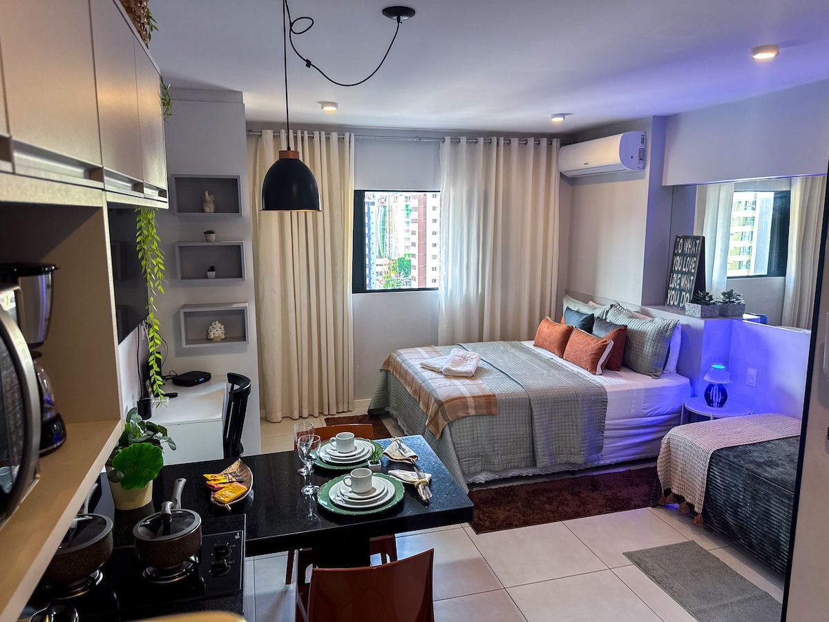 Komportableng studio apartment na matatagpuan sa Ponta Verde, isang marangal na kapitbahayan ng Maceió. Matatagpuan 300m mula sa beach, 650m mula sa Pajuçara handicraft fair, 1.8km mula sa mga natural na pool ng Maceió at malapit sa mga bar, restawran, supermarket at shopping mall, ito ay nasa puso ng Maceió. Kasama sa studio ang Smart TV, wifi at pribadong banyo na may shower, hair dryer at de - kuryenteng plantsa, habang ang kusina ay may microwave, refrigerator, kalan, coffee maker, sandwich maker, mga kaldero at kawali, pinggan, tasa, baso ng alak.