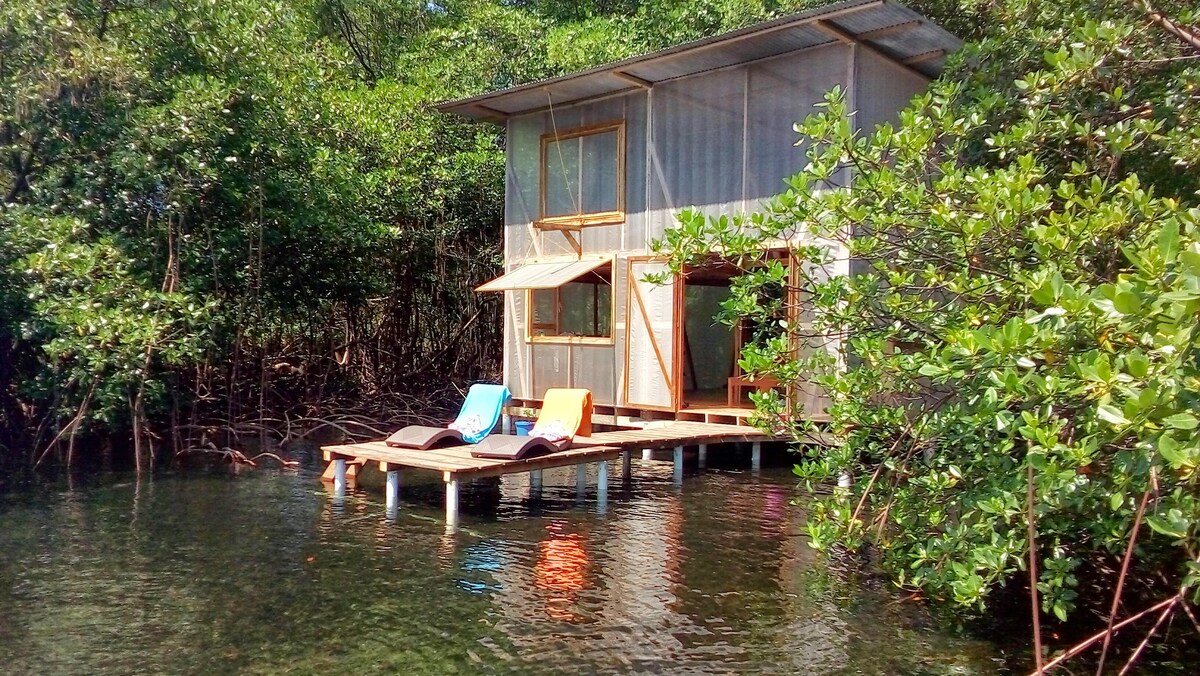 This secluded loft-style treehouse sits on stilts above the water, 30 feet from our colorful coral reef. Transparent and airy but bug proof walls let you enjoy the fresh ocean breeze and views while keeping you safe and cozy. When a sloth comes to visit, no need to leave the house to see him! Blend in with the surroundings of mangrove, lagoon and jungle, and enjoy water and reef access from your own deck. Bright and airy, 100% eco-conscious.
