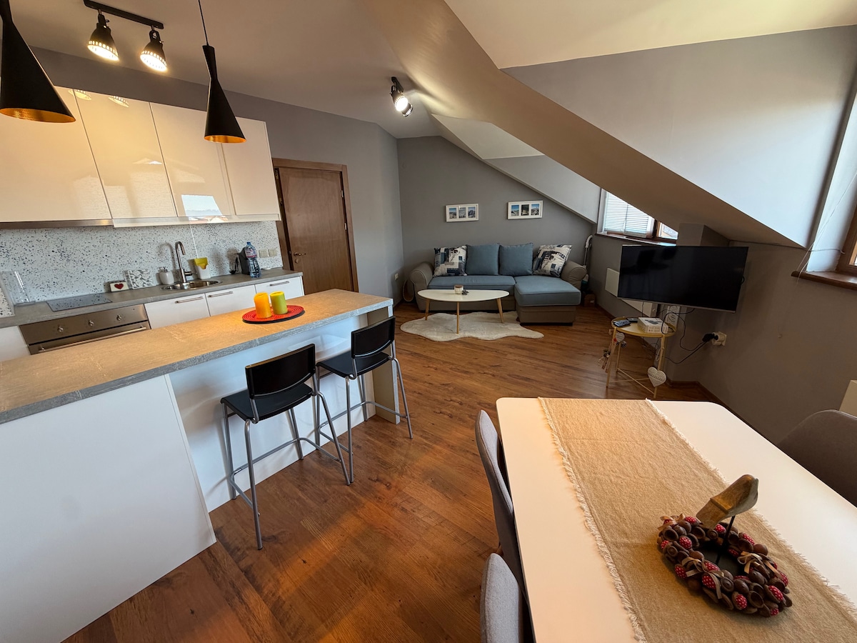 Ang kaakit - akit na one - bedroom apartment na ito ay may malawak na sala na may balkonahe sa tuktok na palapag. Ang gusali mismo ay matatagpuan sa pinakamataas na punto ng Bansko na may malawak na tanawin ng bundok, sa hangganan mismo ng Pirin National Park, at ang panimulang punto ng maraming ruta ng hiking. Ang bahaging ito ng lungsod ay tahimik at kalmado, hindi masikip, at mainam para sa pagkakaroon ng pahinga.