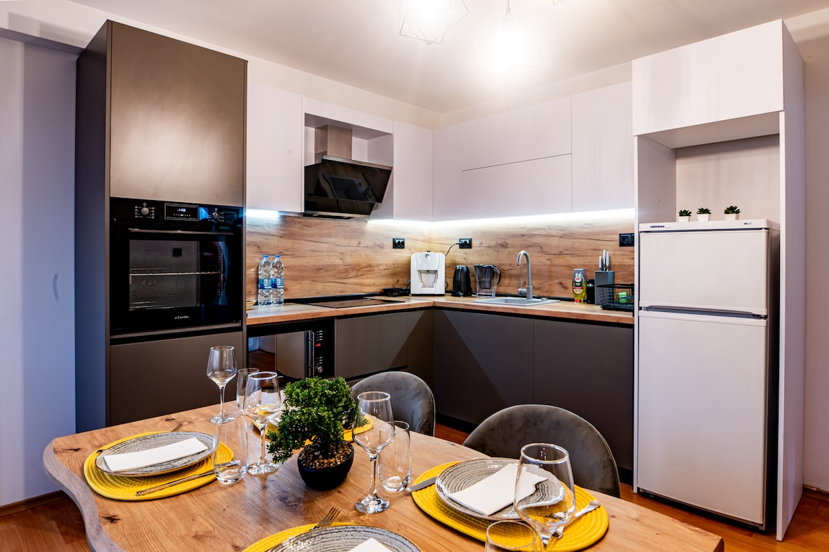 Maligayang pagdating sa Viora – isang bagong inayos at naka - istilong apartment na perpekto para sa mga pamilya o grupo. Nag - aalok ang property ng dalawang komportableng kuwarto, kumpletong kusina, banyong may estilo ng spa, at malawak na sala na may sofa bed at mga nakamamanghang malalawak na tanawin. Ang mabilis na Wi - Fi, smart TV, at eleganteng palamuti ay gumagawa ng perpektong setting para sa isang nakakarelaks na pamamalagi. Matatagpuan 2.4 km mula sa sentro ng bayan, malapit sa mga tindahan, restawran, at atraksyon. May mga lugar para sa paninigarilyo ang parehong balkonahe.