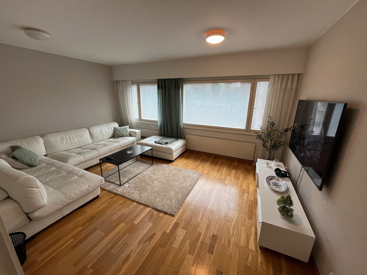 Hyvällä maulla sisustettu valoisa uusi kaksio aivan kauppakeskus Puuvillan vieressä. Asunnon sijainti on hyvin keskeinen mutta kuitenkin ilman liikenteen melua. Keskustaan n.1km, Kirjurinluotoon 900m. Huoneistossa on kaikki tarvittavat kodinkoneet sekä kuivaava pyykinpesukone. Parivuode ja kahden hengen vuodesohva. Tarvittaessa käyttöön saa lisäksi varavuoteen yhdelle. Huoneistossa 55 tuumainen TV, radio ja Wifi/valokuitu. Viihtyisä patio pihakalusteineen ja autopaikka pihassa.