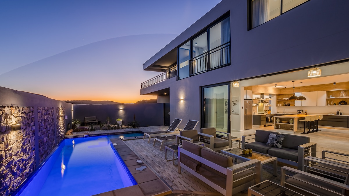 Umthi Lodge is a guesthouse on a private nature reserve in South Africa, with views of wild game all around. Situated on the unspoiled natural coastline of the Eastern Cape, with private access to a beautiful beach and lagoon. Sleeps 8 people plus a cot bed. Free unlimited high speed WiFi. The pool is heated all year round, and the house has a Tesla battery and solar system to ensure it always has reliable energy supply. Note: We don't accept bookings of large groups for a weekend.