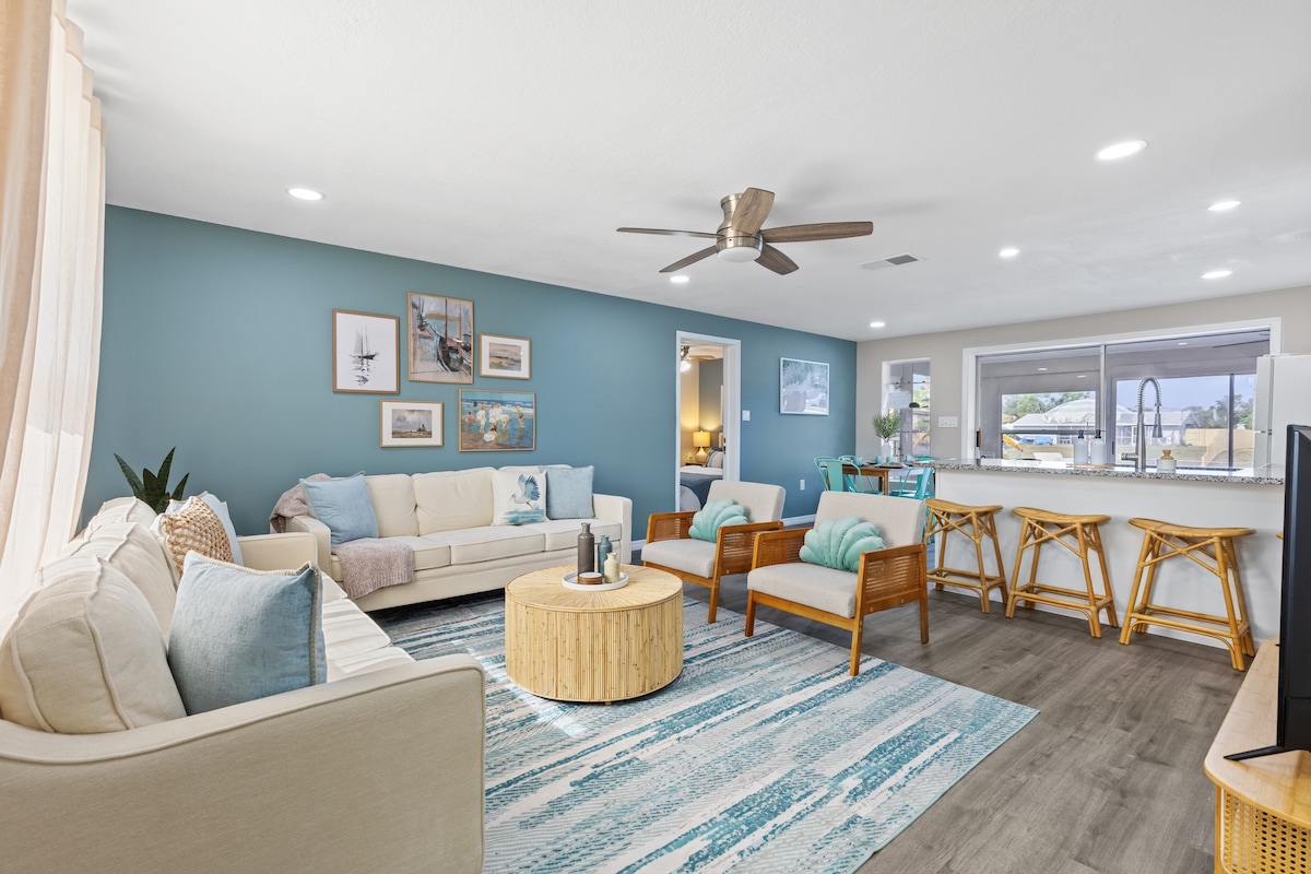 Tuklasin ang pribado at modernong tuluyan namin na parang Euro Villa. Maganda ang lokasyon nito dahil may direktang access sa kanal papunta sa Charlotte Harbor at madali itong mararating sa bangka papunta sa Gulf of Mexico. Magrelaks sa malawak at malalim na pinainitang pool na may tubig‑asin na napapalibutan ng tropikal na tanim at magandang tanawin mula sa mga pribadong balkonahe. Mag‑enjoy sa mga kalapit na restawran, tindahan ng grocery, gasolinahan, parke, at beach. Malalawak na indoor at outdoor area ang naghihintay sa pamilya at mga kaibigan mo—mag-book na para sa di-malilimutang bakasyon sa baybayin!
