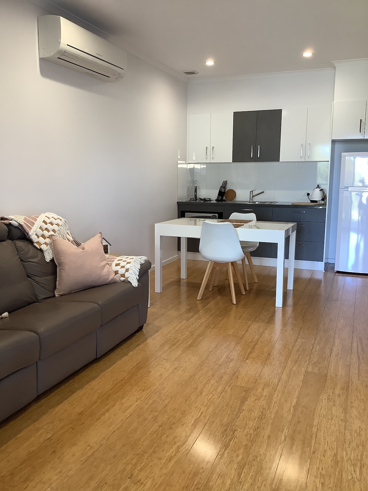 Spend your Airbnb getaway at this Unit in Wallaroo. The unit is open plan with a step-up bedroom with queen bed, lounge area with 50” TV, dining and kitchenette area and a private outdoor courtyard area with table and bench chair. The unit is conveniently located near Wallaroo’s popular tourist attractions and main street. Guests have the whole place to themselves. This includes a bedroom, a bathroom and kitchen. There is roadside parking only.