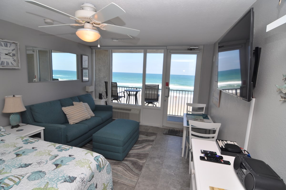 Pagtatanong @ 570 234 0504 Maligayang pagdating sa iyong buhay sa beach! * Bukas ang North swimming pool (pinainit) * *Sea wall under construction - Beach access sa pamamagitan ng silver beach avenue - 3 min paglalakad* Pumasok sa magandang studio na ito na matatagpuan sa Ocean Jewels club. Nasa beach mismo at malapit sa boardwalk, Daytona 500, Magagandang restawran, tindahan, libangan, kapana - panabik na atraksyon, at landmark. ✔ Kumportableng Queen - Size Bed +futon Kusina ✔ na Kumpleto ang Kagamitan ✔ Smart TV ✔ High - Speed na Wi - Fi ✔ Swimming pool (pinainit)