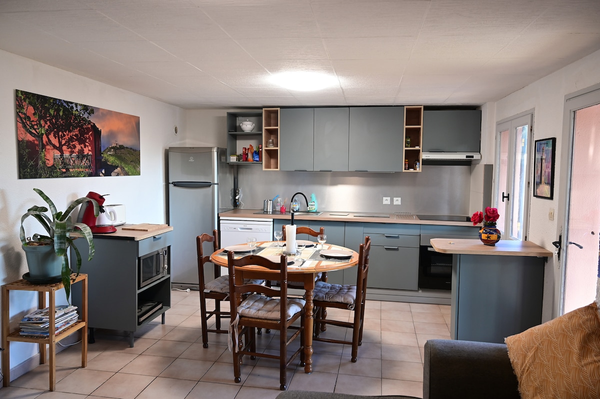 50 m2 na tuluyan na may 2 malaking kuwarto na may direktang access sa banyo. Isang TV kada kuwarto. Kitchenette na may mga induction plate, microwave, refrigerator, coffee maker, at kettle. Mayroon ka ng lahat ng kailangan mo para magluto. May mesa na may matataas na upuan sa kusina. Walang sala Apartment na may nababaligtad na air conditioning. Malapit sa daungan at lahat ng tindahan. Malapit sa Collioure, 30 minutong lakad o 5 minutong biyahe sa bus na nagkakahalaga ng €1.