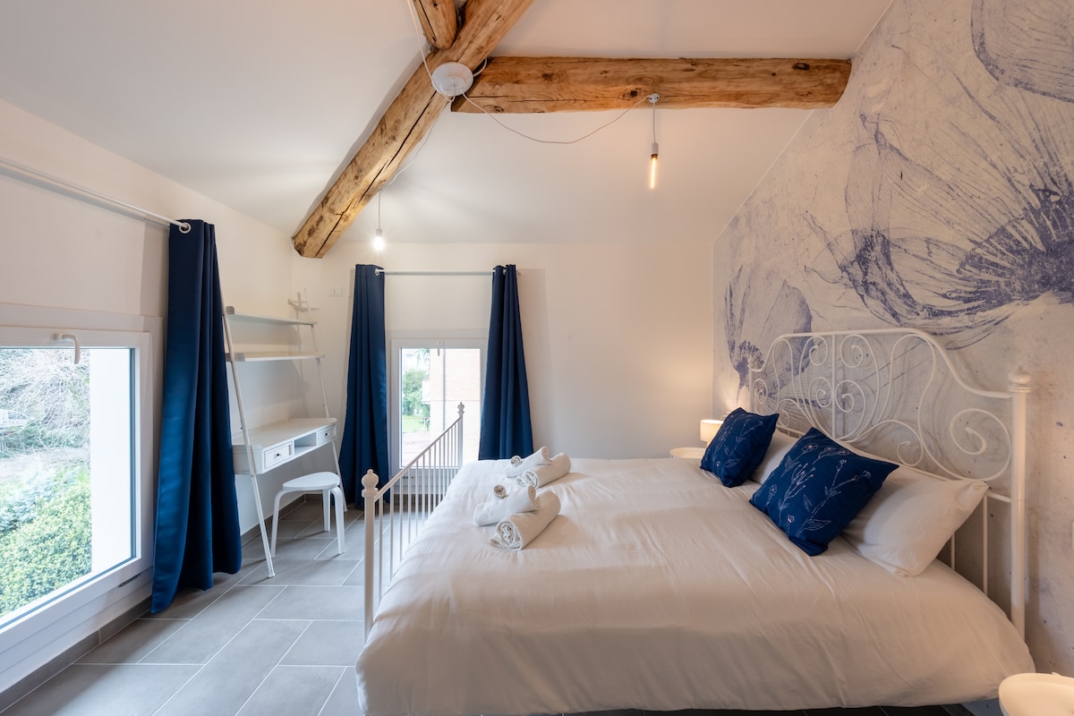 Magrelaks sa apartment na ito na may independiyenteng pasukan, na nasa mga burol ng Bologna, ang lugar ng Valsamoggia na humigit - kumulang 20 km mula sa Bologna, na mapupuntahan gamit ang kotse. Bahagi ang apartment ng isang late 1800s farmhouse na na - renovate na nagpapanatili ng orihinal na estruktura: nakalantad na kahoy na kisame, fireplace, orihinal na muwebles. Available sa labas: gazebo na may mesa, armchair, ihawan. Nakapaligid na lupain ng pag - aari ng 3 ektarya na may lawa. Available din ang Wi - Fi na angkop para sa matalinong pagtatrabaho.